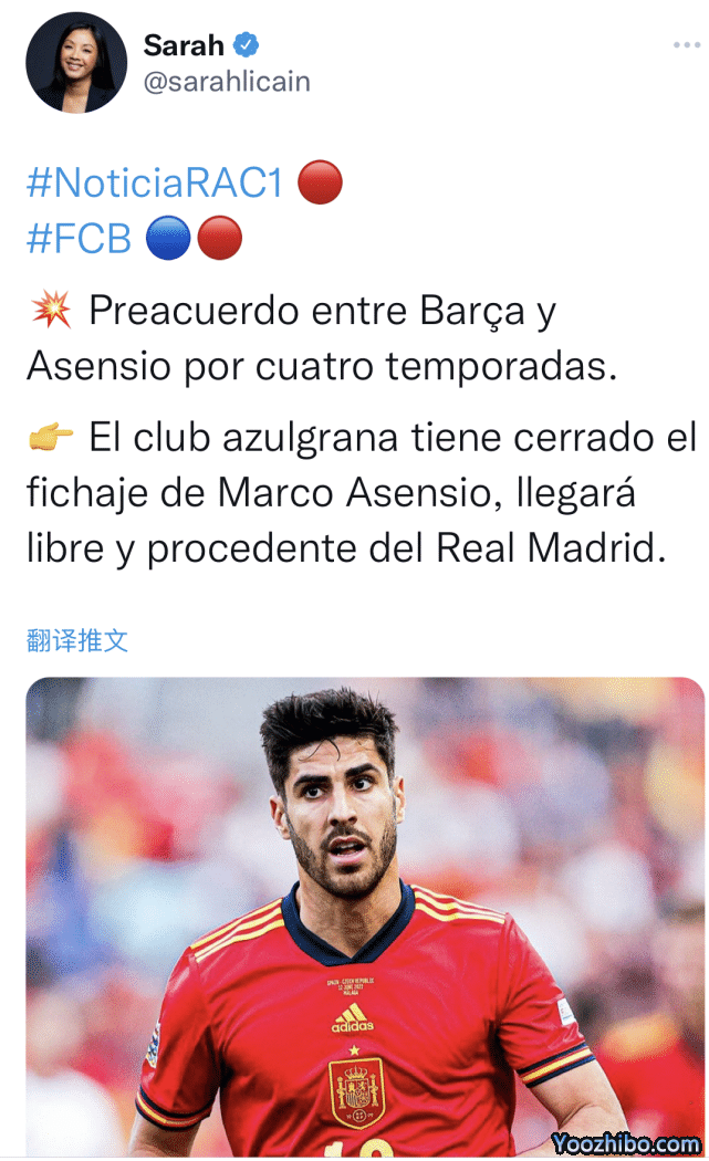 24直播网09月26日晚,西班牙知名媒体RCA1记者Sarah Li Cain扔出了一则重量级消息,效力于皇马的26岁“王储”阿森西奥已经与巴萨完成了签约。双方签下了一份为期4个赛季的预先协议。由于与皇马的合同只剩1年,阿森西奥将在明夏以自由球员的身份加盟死敌。