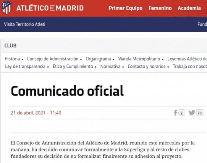 24直播网4月22日讯 马竞官方宣布,俱乐部不再参与欧洲超级联赛计划。