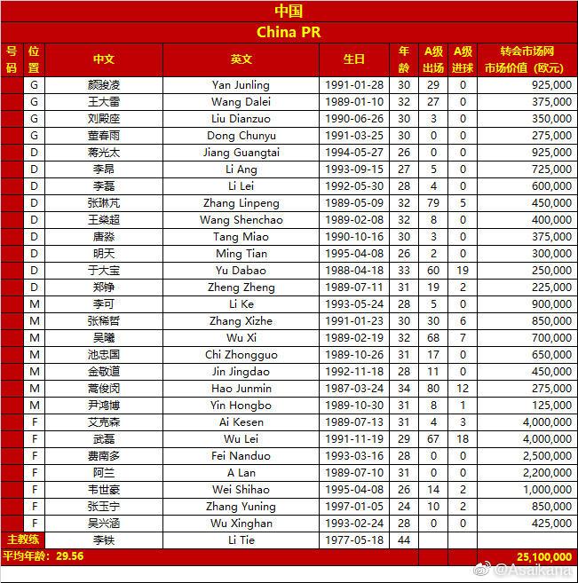24直播网讯 据德国转会市场网的中国区管理员朱艺统计,新一期国足大名单总身价2510万欧元,平均年龄29.56岁。