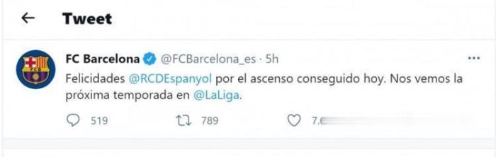 巴萨在推特写道:祝贺西班牙人队今天获得升级资格,我们下赛季西甲见。