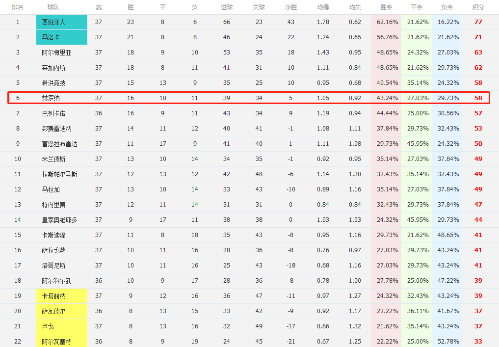 从本轮和近期的表现来看,本赛季双杀西班牙人的西班牙人克星赫罗纳出现了战绩狂飙的盛况,本轮1-0战胜了特内里费,从而实现了大逆袭+3连胜的壮举,连续三场都是零封对手取胜,快速逆袭杀入前六名,本轮先赛超越了巴列卡诺,虽然巴列卡诺本轮赢球将再超赫罗纳,但是赫罗纳已经追平了希洪竞技的积分,希洪竞技本轮0-0与莱加内斯战平,从而被赫罗纳追上。