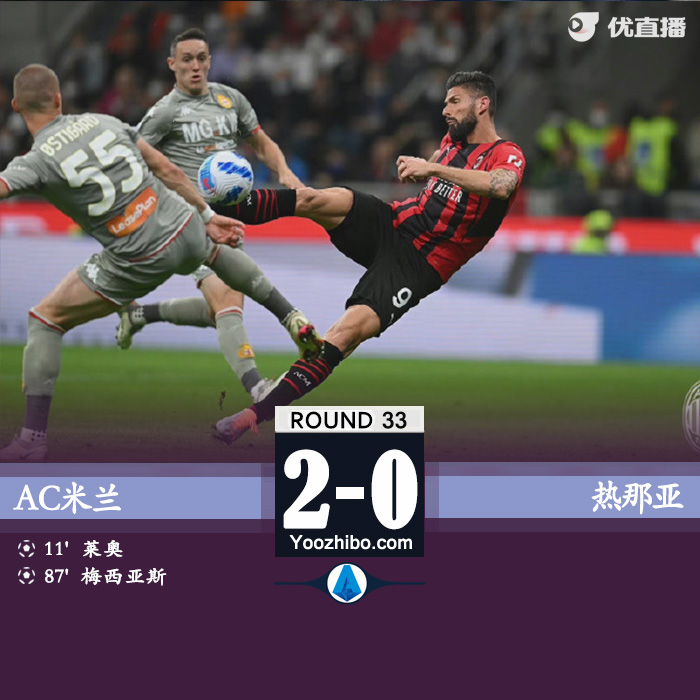北京时间4月16日凌晨3点整,2021-22赛季意甲第33轮在圣西罗球场展开角逐,AC米兰坐镇主场迎战热那亚。上半场卡卢卢助攻,莱奥首开纪录,下半场梅西亚斯替补锁定胜局。最终AC米兰主场2-0战胜热那亚,米兰终结联赛两连平。积分榜方面,米兰多赛一场积71分,领先国米2分重回榜首。
