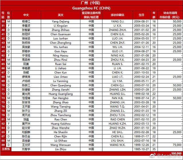 24直播网讯 德转中国区管理员朱艺昨日公布了广州队的亚冠小组赛大名单,由U22全华班组成,其中还包括6名U17球员。