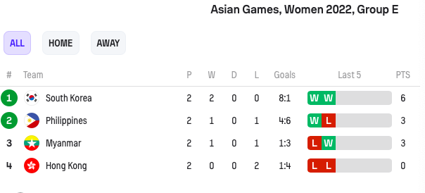 韩国女足2连胜积6分领跑,菲律宾和缅甸同为1胜1负积3分,菲律宾净胜球优势占优位列次席。中国香港女足2连败,暂时垫底。