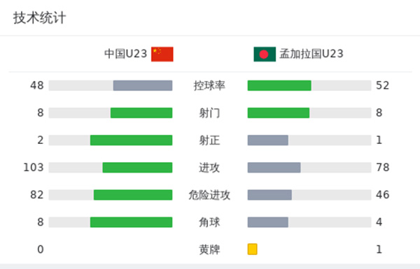 全场比赛结束,中国0-0孟加拉国。