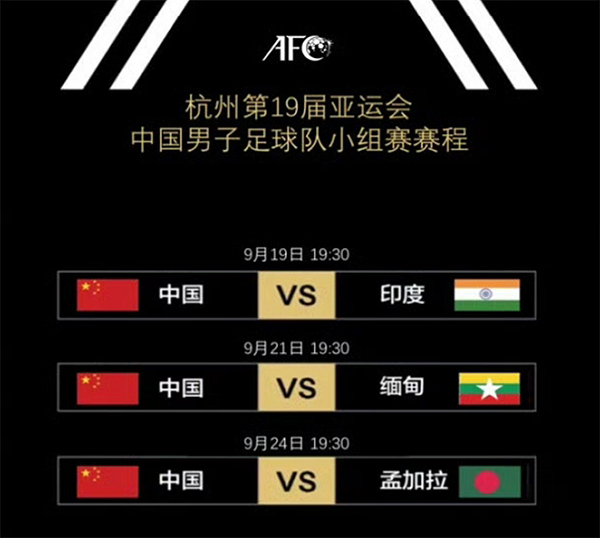 中国亚运男足被分在A组,同组的有孟加拉国、缅甸、印度,对手的实力都不是很强,中国队的首个对手是印度,比赛时间是9月19日19:30,中国亚运男足正式踏上本届杭州亚运会的征程,主场作战,力争取得好成绩。