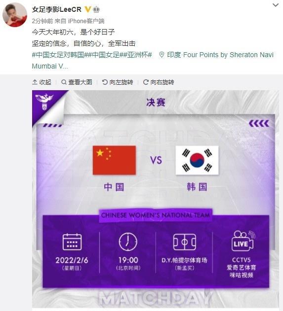 24直播网02月06日讯 今晚,中国女足将在亚洲杯决赛中迎战韩国女足,李影赛前发了微博鼓励球队。