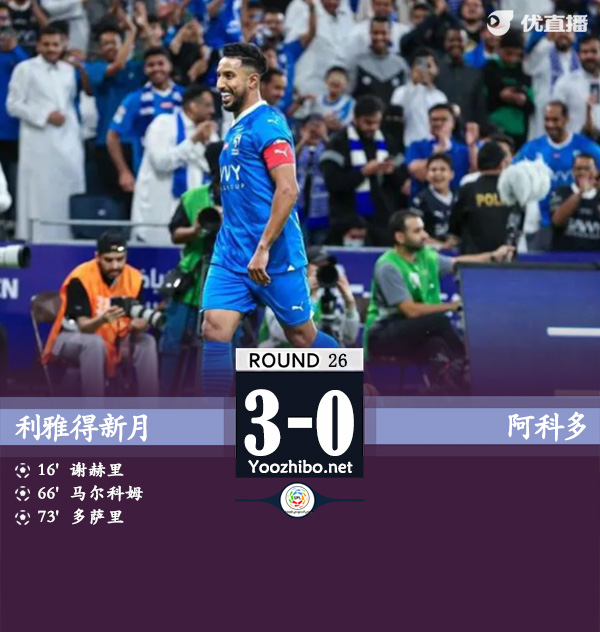 北京时间4月3日03:00,沙特联赛第26轮利雅得新月迎战阿科多的比赛,上半场内维斯助攻谢赫里头球破门,科利亚多失单刀,下半场达瓦萨里助攻马尔科姆单刀破门,内维斯助攻多萨里推射扩大比分,最终利雅得新月3-0阿科多豪取31连胜12分领跑。