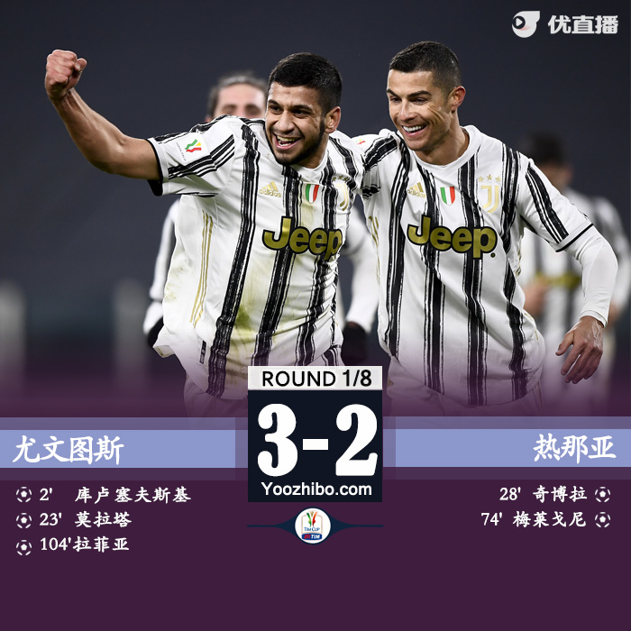 北京时间1月14日4:15,意大利杯1/8决赛,尤文迎战热那亚。上半时库卢塞夫斯基斩传射,莫拉塔破门,茨博拉扳回1球,尤文两粒进球越位在先无效。下半时皮亚察中框,梅莱格尼扳平比分。90分钟战罢2-2双方进加时,加时上半时莫拉塔达成传射助拉菲亚破门,加时下半时阿图尔门线救主。最终,尤文3-2热那亚晋级,尤文1/4决赛将对阵萨索洛与斯帕尔之间的胜者。
