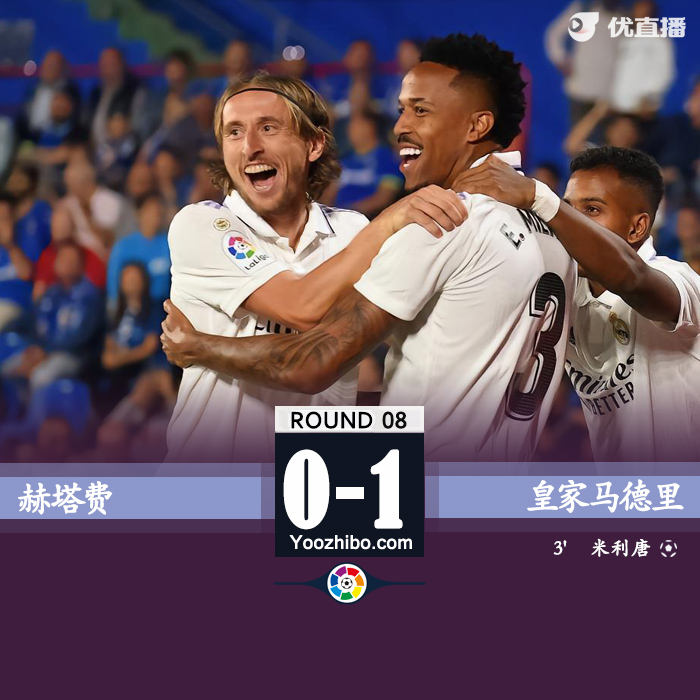 北京时间10月9日03:00,西甲联赛第8轮,赫塔费迎战皇家马德里。上半场比赛,莫德里奇助攻米利唐头球破门,莫德里奇、罗德里戈尝试了多次远射。半场战罢,皇马1-0赫塔费。下半场比赛,皇马禁区内连续3脚打门被解围,众将多次远射均未能破门。最终全场比赛结束,皇马客场1-0赫塔费。