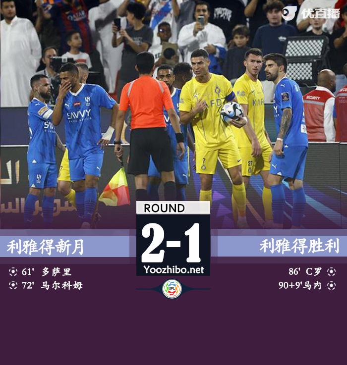北京时间4月9日沙超杯半决赛,利雅得新月主场对阵利雅得胜利。上半场奥斯皮纳连续做出关键扑救,C罗连续多脚打门造险,下半场达瓦萨里首开记录,马尔科姆头球破门,C罗染红离场,马内最后时刻扳回一球。最终比分利雅得新月2-1利雅得胜利。