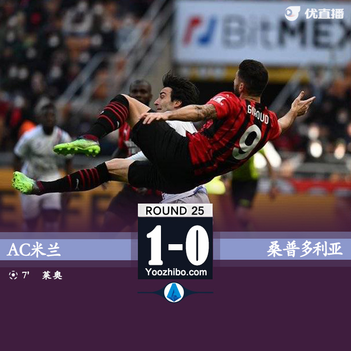 北京时间2月13日晚19:30,意甲第25轮比赛继续进行,AC米兰对阵桑普多利亚。上半场,迈尼昂助攻莱奥一条龙破门;下半场,双方互有攻守,没有进球产生。最终,AC米兰主场1-0战胜桑普多利亚,迎来联赛两连胜的同时暂时升至积分榜首位。