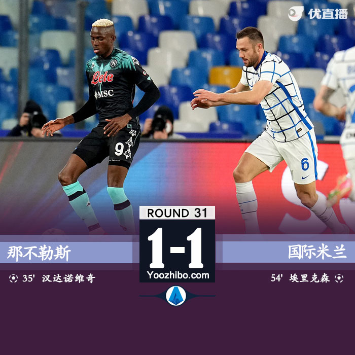 北京时间4月19日凌晨2点45分,2020-21赛季意甲第31轮焦点战在马拉多纳球场展开角逐,那不勒斯坐镇主场迎战国际米兰。上半场卢卡库两次中框,汉达诺维奇乌龙球,下半场埃里克森远射扳平,波利塔诺中框。最终国际米兰客场1-1战平那不勒斯,国米联赛11连胜遭终结。积分榜方面,国米积75分以9分优势领跑,那不勒斯积60分位居第5名。