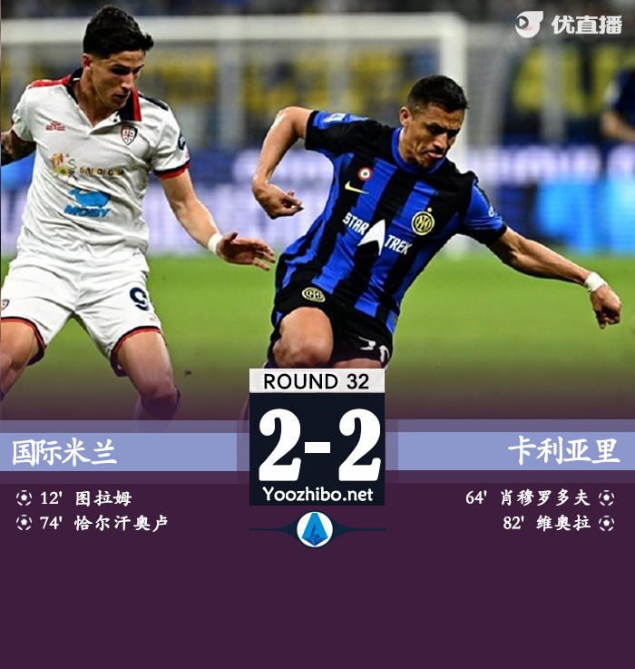 北京时间4月15日,意甲第32轮,国米主场迎战卡利亚里。上半场,桑切斯助攻图拉姆先拔头筹,巴雷拉头球吊射破门越位在先被吹。易边再战,肖穆罗多夫破门,恰尔汗奥卢点射再次超出比分,维奥拉再次帮助客队扳平,拉帕杜拉手球助攻引争议。最终国米2-2卡利亚里。积分榜方面,国米26轮不败14分领跑,卡利亚里31分第14。