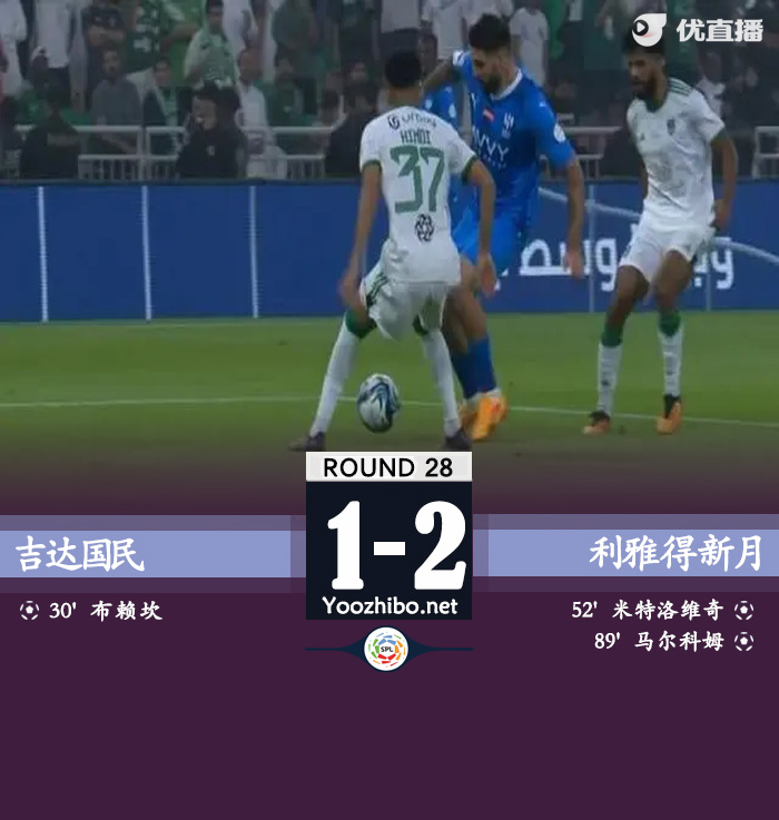 北京时间5月7日凌晨2时整,2023-24赛季沙特联第28轮补赛展开角逐,吉达国民坐镇主场迎战利雅得新月,上半场马赫雷斯中柱,布赖坎打破僵局,下半场米特洛维奇头球扳平,马尔科姆一条龙绝杀。最终利雅得新月客场2-1逆转吉达国民,新月联赛30轮不败,积分榜方面,新月领先第2名胜利12分居榜首,再拿1分即夺冠,国民积55分位列第3。