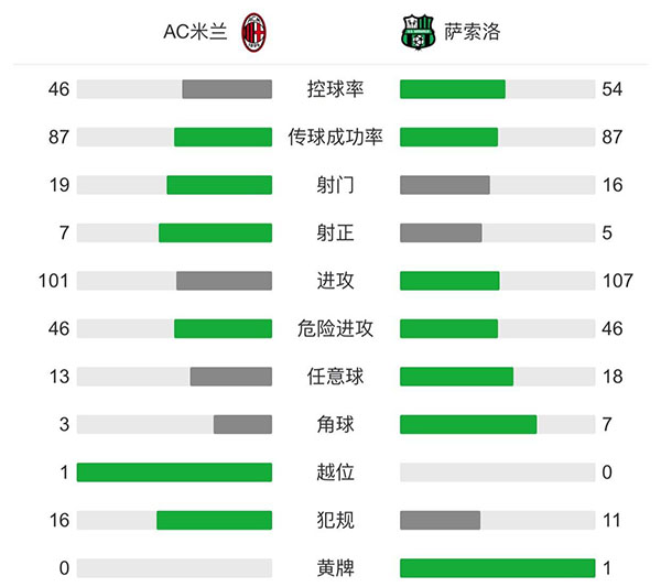 全场比赛结束,米兰1-2遭萨索洛逆转。