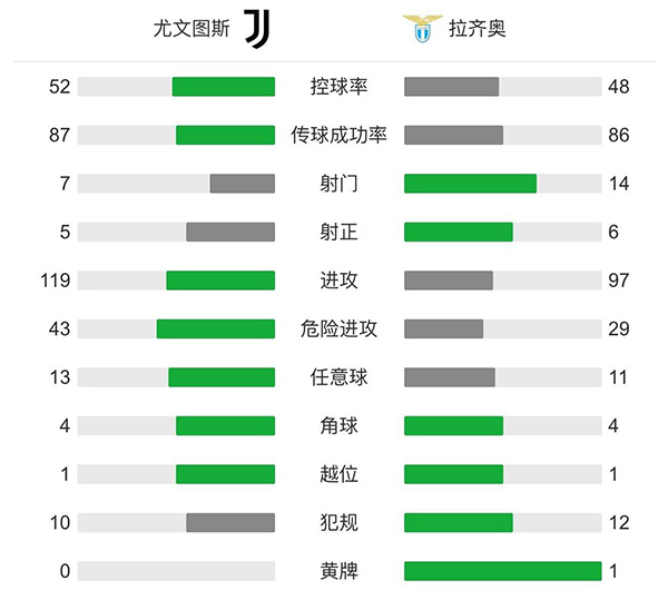 全场比赛结束,尤文图斯主场3-1战胜拉齐奥。