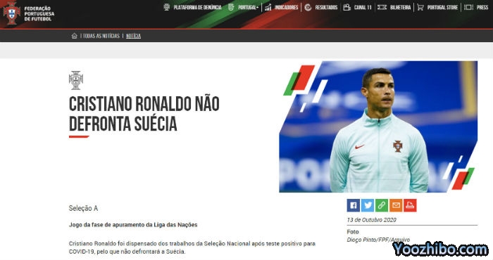 “队长C罗因在新冠检测中呈阳性,已经离开球队并不将参加接下来对阵瑞典的比赛。球员本人状态良好,无感染症状并正进行隔离。剩下的球员在周二早上进行了再次检测并都呈阴性,他们将被准许进行训练并继续备战欧国联的比赛。”