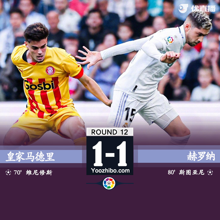 北京时间10月30日23点15分,西甲第12轮皇家马德里主场对阵赫罗纳。上半场,罗德里戈射中立柱,埃雷拉爆射回敬一脚门框。下半场,维尼修斯破门,阿森西奥送点,斯图尼亚点射扳平,罗德里戈进球被吹,克罗斯两黄变一红被罚下。全场比赛结束,皇家马德里1-1赫罗纳。