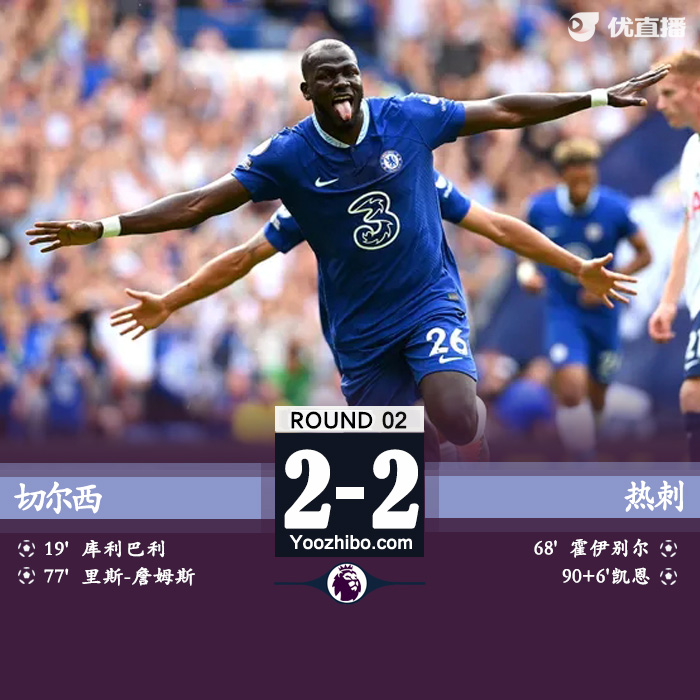 北京时间8月14日晚23:30,英超第2轮的一场焦点比赛即将进行,蓝军切尔西坐镇主场对战热刺,上半场,库库雷利亚助攻库利巴利打破僵局,上半场比赛结束,切尔西1-0热刺暂时领先;下半场,霍伊别尔扳平比分,斯特林助攻里斯詹姆斯破门反超比分,凯恩补时阶段头球绝平,最终全场比赛结束,切尔西2-2热刺。