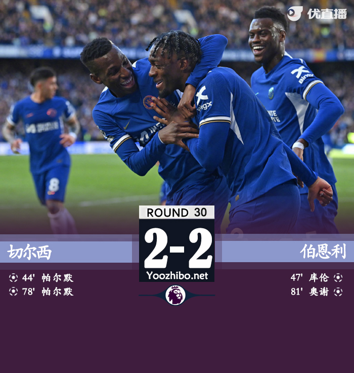 北京时间3月30日23:00,2023-24赛季英超联赛第30轮,切尔西坐镇斯坦福桥球场迎战伯恩利。上半场迪萨西进球被吹,穆德里克造点,阿西尼翁两黄变一红被罚下,帕尔默勺子点球命中,切尔西暂1-0伯恩利;下半场库伦为伯恩利扳平比分,斯特林助攻帕尔默再下一城,伯恩利由达拉-奥谢再度扳平,古斯托伤退,最终切尔西2-2伯恩利,无缘连胜。