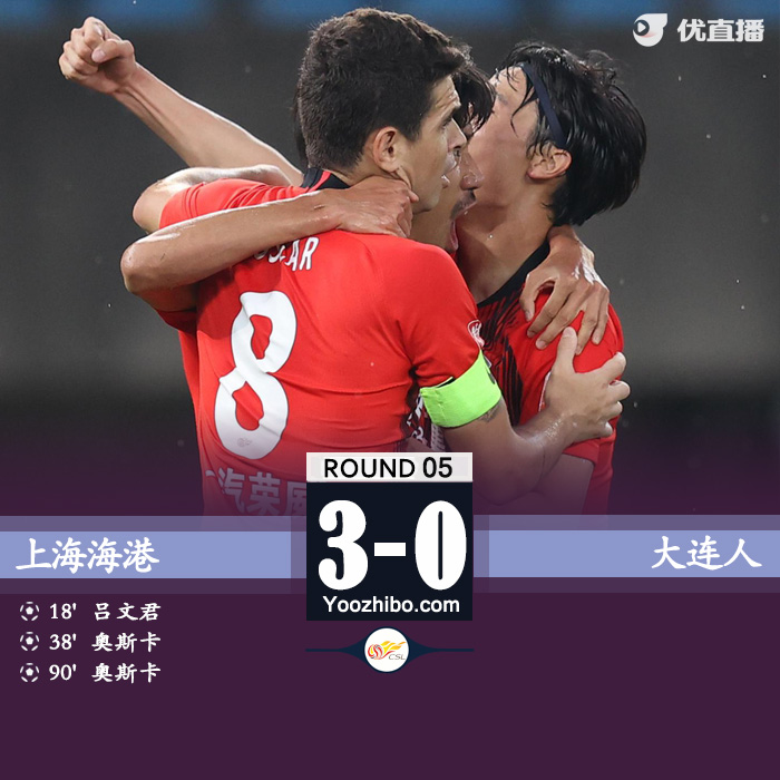 北京时间5月16日18:00,中超联赛第5轮,上海海港对阵大连人。上半场比赛,李申圆边路传中助攻吕文君破门,奥斯卡中超百场里程碑兜射死角扩大比分。下半场比赛,奥斯卡点球破门完成梅开二度。全场比赛结束,海港3-0战胜大连人。