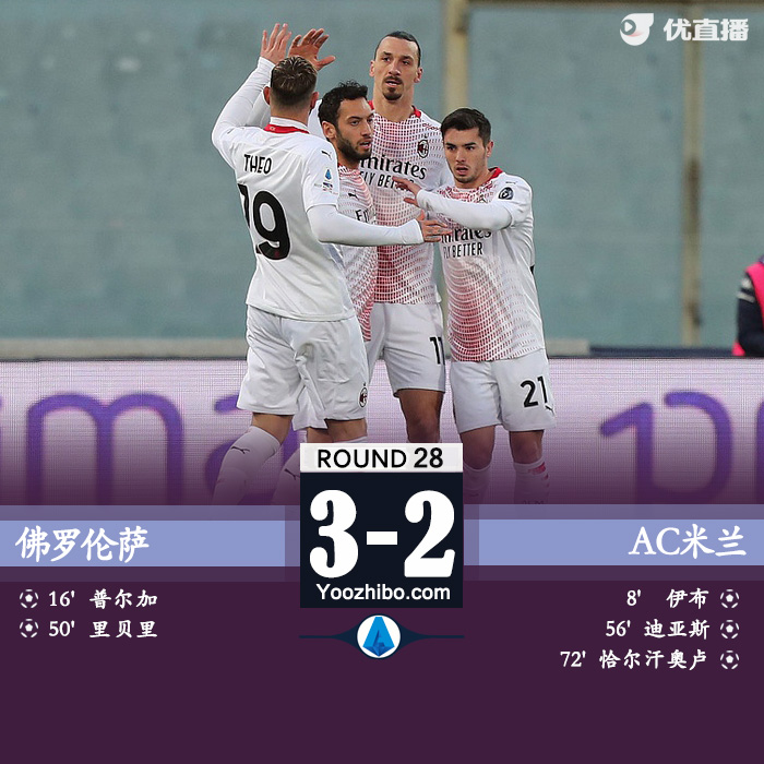 意甲第28轮。AC米兰客场挑战佛罗伦萨。伊布首开纪录,普尔加直接任意球扳平比分,上半场结束。下半场里贝里进球,佛罗伦萨2-1领先AC米兰。迪亚斯接克亚尔摆渡,门前射门得分,比分扳为2-2,克亚尔助攻双响。凯西助攻,恰尔汗奥卢抽射得手。米兰最终3-2逆转佛罗伦萨,从客场全取三分,先赛一场落后榜首6分。