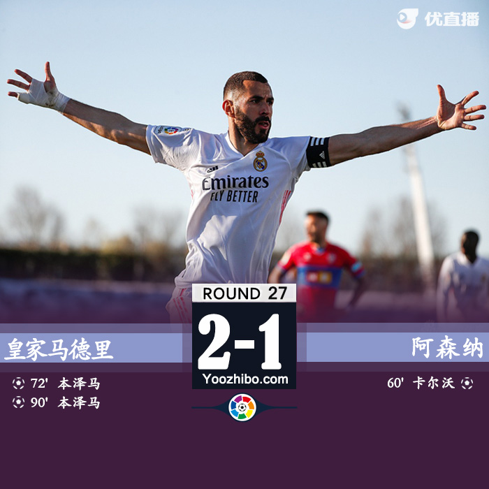 北京时间3月13日晚23点15分,2020-21赛季西甲第27轮在迪斯蒂法诺球场展开角逐,皇家马德里坐镇主场迎战埃尔切。上半场双方均无建树,下半场卡尔沃先拔头筹,本泽马头球扳平,阿扎尔复出替补登场,本泽马补时绝杀。最终皇家马德里主场2-1逆转埃尔切。积分榜方面,皇马落后榜首马竞5分,暂居第2名。