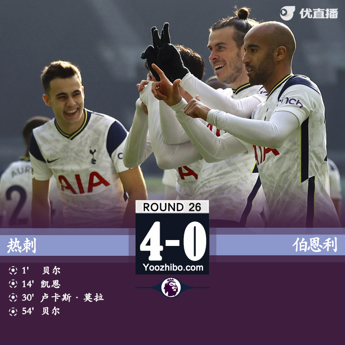 北京时间2月28日22:00,英超第26轮继续进行,热刺坐镇主场迎战伯恩利。上半场开场68秒,贝尔接孙兴慜助攻打进闪电进球帮热刺取得领先,此球为英超球队对阵伯恩利的最快进球,随后贝尔又送出长传助攻凯恩扩大比分,雷吉隆助攻小卢卡斯再入一球。下半场,贝尔再次接孙兴慜助攻完成双响。最终,热刺4-0大胜伯恩利,结束两连败。