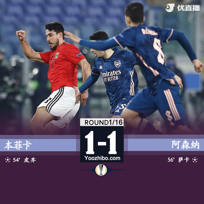 北京时间2月19日4:00,欧联杯1/16决赛首回合一场比赛在本菲卡和阿森纳之间进行。上半场奥巴梅扬失良机,扎卡传球失误险些造成丢球。下半场史密斯-罗送点皮齐主罚命中,萨卡扳平比分,奥巴梅扬再次错失机会。最终阿森纳客场1-1战平本菲卡,双方次回合较量将在2月26日进行。