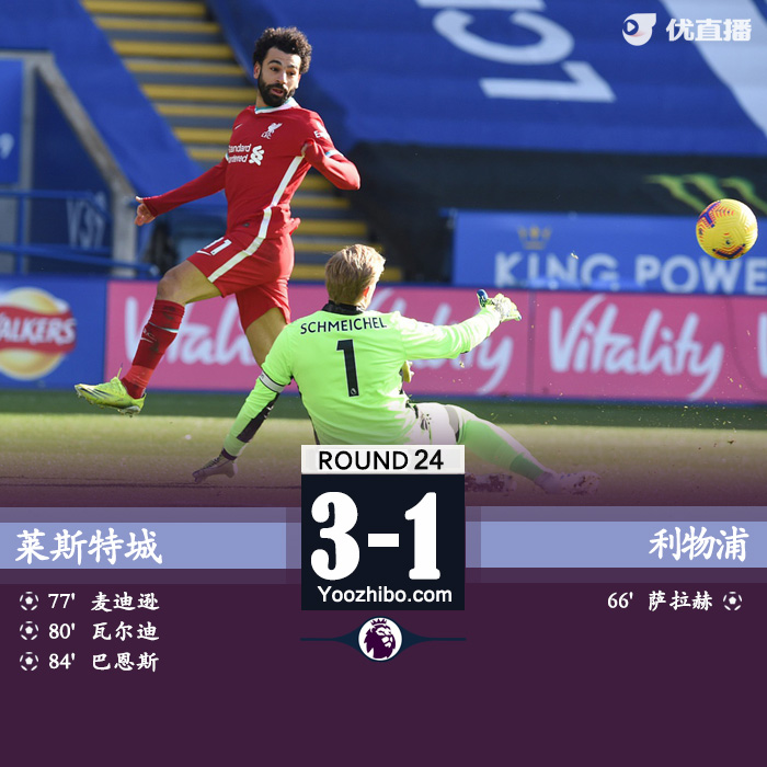 北京时间2月13日20点30分,英超第24轮莱斯特城主场迎来强敌利物浦。上半场,米尔纳伤退,利物浦呈现围攻之势但未能破门,小舒梅切尔多次做出成功扑救,瓦尔迪反击射中横梁。下半场,阿诺德任意球攻门击中横梁,萨拉赫兜射破门,麦迪逊任意球扳平比分,利物浦后防失误送礼,瓦尔迪打进反超球,巴恩斯锁定胜局,全场比赛结束,莱斯特城3-1利物浦。本场比赛过后,莱斯特城在多赛2场的情况下拿到46分升到积分榜第二,落后榜首的曼城4分。利物浦遭遇三连败后则是以40分继续排在第四,在先赛一场的情况下仅领先身后的切尔西和西汉姆1分。