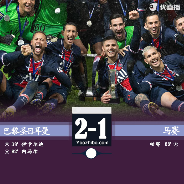 北京时间1月14日4:00,法国超级杯决赛打响,巴黎圣日尔曼迎战马赛。上半场,伊卡尔迪、姆巴佩接连越位进球被吹,伊卡尔迪打破僵局后又击中横梁。下半场,内马尔复出登场点球建功,帕耶扳回一球。全场比赛结束,巴黎2-1战胜马赛,连续八年夺得法国超级杯。