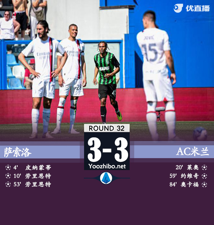 北京时间4月14日,意甲联赛迎来第32轮的激烈对决,萨索洛与AC米兰展开了激烈的较量。上半场刚开场皮纳蒙蒂闪击建功,随后劳里恩特突入禁区射门被扑随后补射破门,之后莱奥1V2后低射追回一球。下半场阿德利被抢断,劳里恩特破门完成双响,随后莱奥外脚背传中被扑,约维奇补射破门,比赛尾声加比亚胸部一停,奥卡福尔抽射扳平,本场比赛丘库埃泽两粒进球被吹体毛越位。最终米兰3-3战平萨索洛。