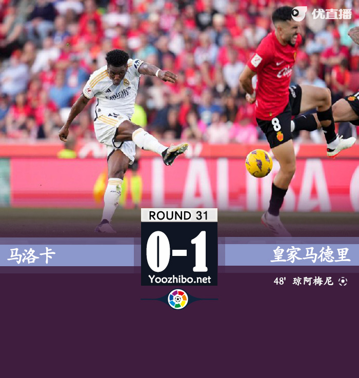 北京时间4月14日,西甲联赛第31轮,马略卡队主场迎战皇家马德里队。上半场,赖洛头球攻门被卢宁扑出,贝林厄姆远射击中门框。下半场,楚阿梅尼世界波破门,卜拉欣-迪亚斯抽射被扑,最终,皇马客场1-0马略卡迎联赛4连胜。