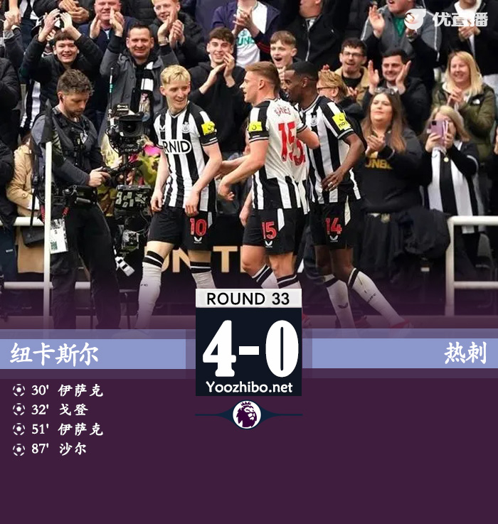 北京时间4月13日在英超联赛第33轮的比赛中,纽卡斯尔联队在主场迎战托特纳姆热刺队。伊萨克在比赛中攻入两球,安东尼-戈登和法比安-舍尔也各自有进球。最终比分是纽卡斯尔联 4-0 托特纳姆热刺。