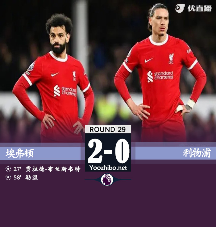 北京时间4月25日凌晨3:00,2023-24赛季英超联赛第29轮补赛,利物浦客战埃弗顿。上半场利物浦后防集体犯错,科纳特乌龙助攻布兰斯韦特破门,努涅斯失单刀,利物浦暂0-1埃弗顿;下半场麦克尼尔角球助攻勒温破门,路易斯-迪亚斯中柱,最终利物浦0-2埃弗顿,距离榜首阿森纳3分,领先少赛两场的曼城1分。