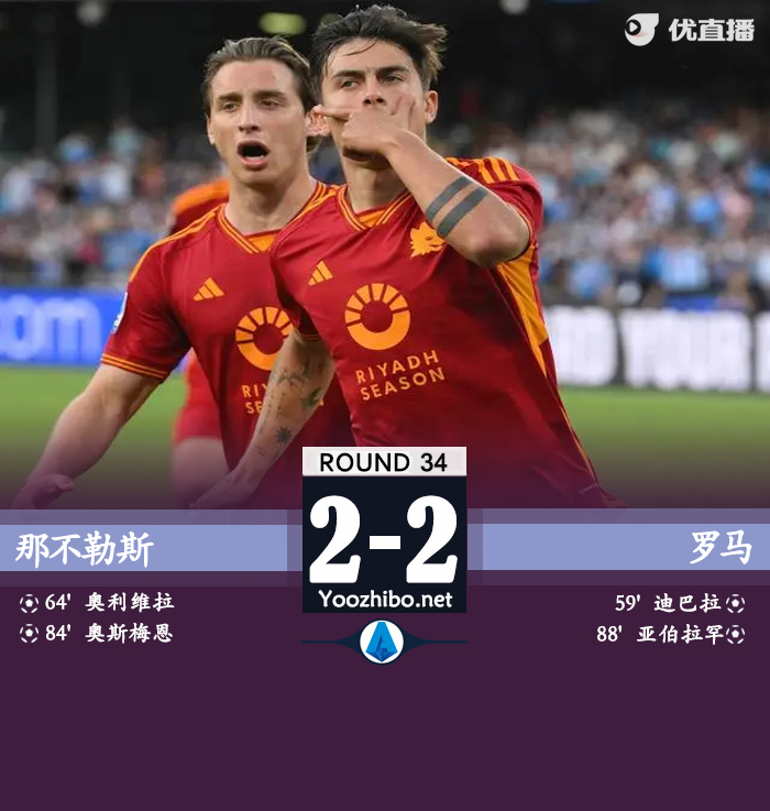 北京时间4月29日,意甲联赛第34轮,罗马客场迎战那不勒斯。上半场双方均无建树。下半场,阿兹蒙造点,迪巴拉点射帮助罗马领先;奥利维拉变线破门扳平;桑谢斯送点,奥斯梅恩点射反超!亚伯拉罕破门被吹越位,但VAR确认进球有效。最终罗马2-2战平那不勒斯,仍然排名第5位列欧冠区,多赛1场领先身后的亚特兰大2分。