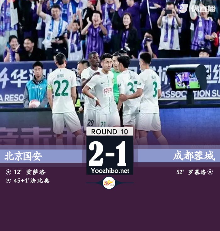 北京时间5月5日19点35分,中超第10轮北京国安主场迎战成都蓉城。上半场,费利佩错失绝佳机会,古加兜射破门,法比奥补时再入一球。下半场,罗慕洛世界波扳回一球后射中一次立柱。全场比赛结束,北京国安2-1成都蓉城。