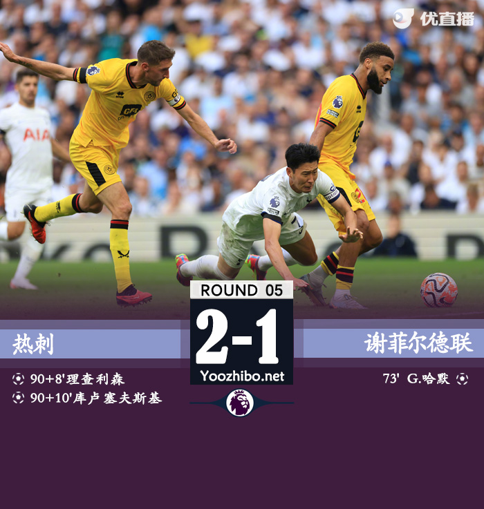北京时间9月16日22点,英超第5轮热刺对阵谢菲尔德联。上半场,热刺场面占据绝对主动但没有制造出绝对的得分机会,谢菲尔德联错失一次不错机会。下半场,热刺依旧久攻不下,哈默打破僵局,约翰逊打进一球但越位在先无效,理查利森替补登场补时阶段扳平比分并且3分钟后助攻库卢塞夫斯基完成绝杀,麦克伯尼两黄变一红被罚下。全场比赛结束,热刺2-1谢菲尔德联。