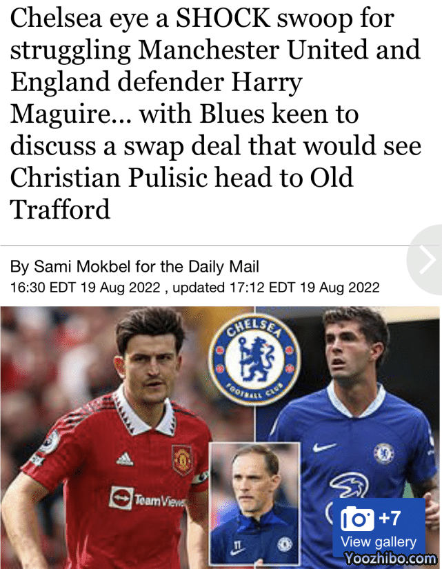 24直播网08月20日讯凌晨,来自英国知名媒体《每日邮报》的消息,英超豪门切尔西已经向曼联询问了签下英格兰中卫哈里-马奎尔的可能性。蓝军甚至愿意将马奎尔,作为曼联引进普利西奇转会的一部分,尝试让两位球员互换东家。目前马奎尔身价为3800万欧元,而身披切尔西10号的美国男足队长普利西奇,身价则是4200万欧元。