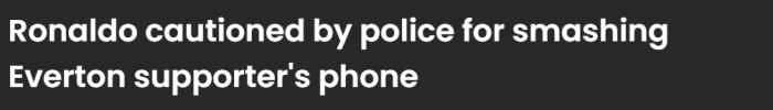 24直播网08月18日讯 默西塞德郡警方证实,C罗砸球迷手机一事已经处理完毕,球员早到警方的附带条件警告。
