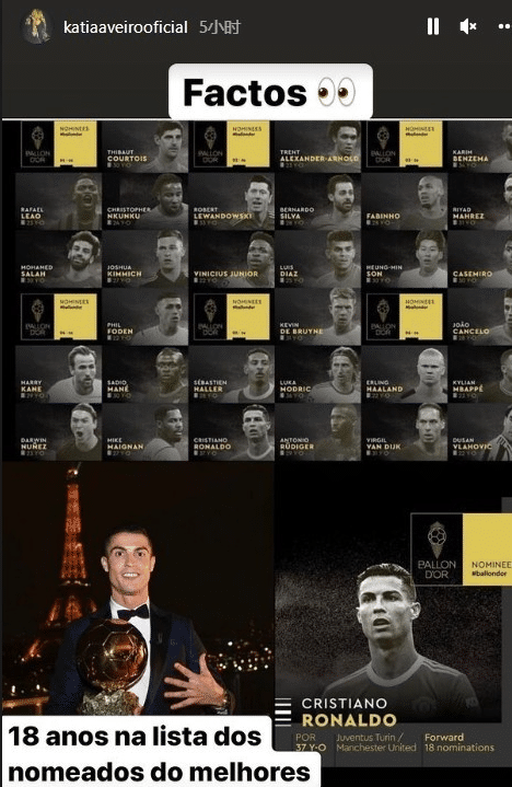 不同于本泽马的“零宣传”,C罗连续18年入选金球奖候选名单,姐姐Katia Aveiro在社交媒体上盛赞,称:“18年连续入选金球奖候选,看起来很简单,不是吗?30人候选名单出来了,那个老男人还是在。”