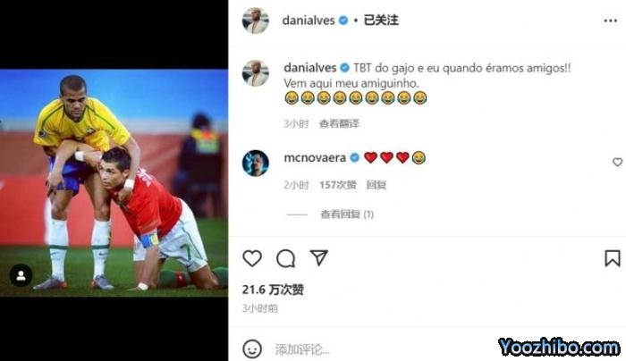 阿尔维斯在INS上晒图,他搀扶起了倒地的C罗,并写道:“来这里,我的小朋友!”这是两人在国家队的照片。