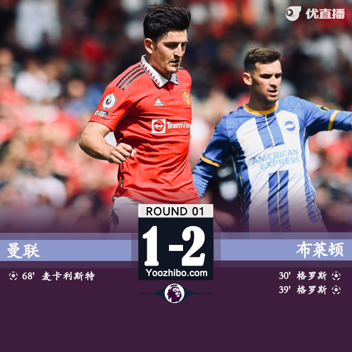 24直播网讯:北京时间8月7日晚间21:00,英超联赛第1轮,曼联对阵布莱顿。上半场,达洛特、弗雷德相继失误险些丢球,格罗斯9分钟内连入两球,曼联未创造出进球良机。下半场,拉什福德屡失良机,麦卡利斯特乌龙送礼。最终,曼联1-2不敌布莱顿。