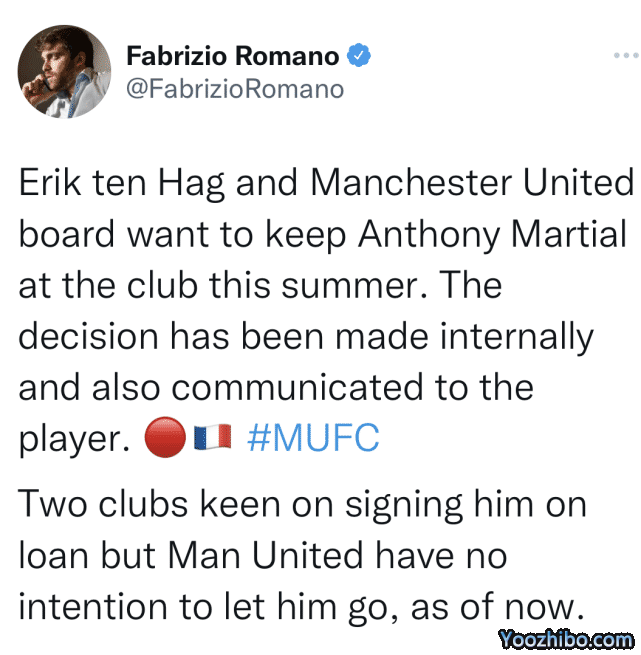 24直播网07月23日讯 凌晨,来自知名转会专家罗马诺的消息,曼联主帅滕哈格和俱乐部高层在内部沟通后,已经决定并通知法国射手马夏尔,新赛季他将会留在曼联。罗马诺透露,有两家俱乐部有意租借马夏尔,但目前曼联无意让他离开。