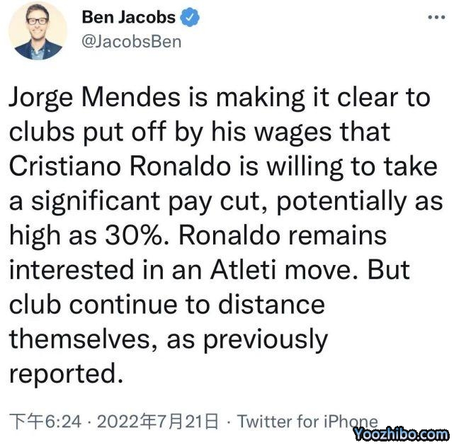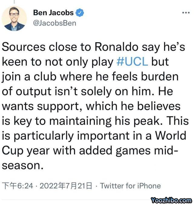24直播网07月22日讯 凌晨, CBS Sport体育记者Ben Jacobs介绍了关于葡萄牙巨星C罗未来去向的最新情况。据C罗身边消息人士透露,在明确今夏离开曼联后,C罗对于自己的下家也提出了要求。