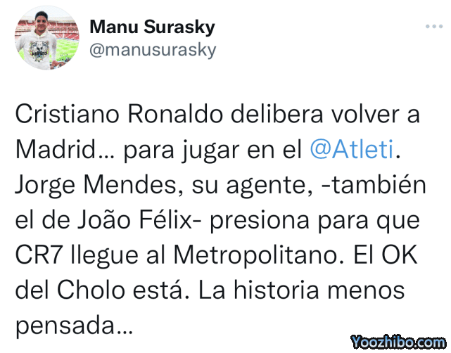 24直播网07月20日讯 凌晨,来自知名记者Manu Surasky的最新消息,葡萄牙巨星C罗已经决定回到马德里,不过他并不会重返皇马,而是加盟皇马的同城死敌马德里竞技队。他的经纪人门德斯(也是马竞7号菲利克斯的经纪人),也正在全力帮助C罗加盟马竞。记罗马诺也确认,C罗与马竞目前已经有过接触,但是还没有正式报价。
