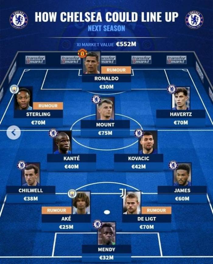德转今天也预测了蓝军下赛季的首发阵容,C罗领衔锋线,绯闻对象斯特林、阿克和德里赫特均在名单中。