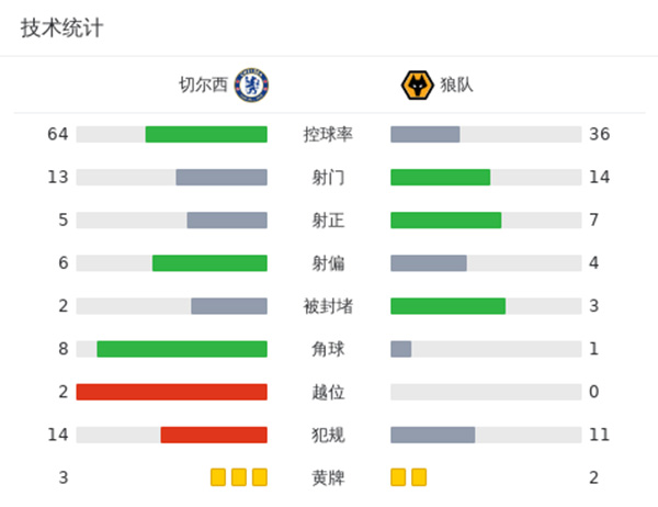 第32分钟,戈麦斯前场斜传禁区,库尼亚禁区左侧调整一步打门,球打在席尔瓦身上发生折射,影响了佩特洛维奇判断,球弹入球门!切尔西1-1狼队↓