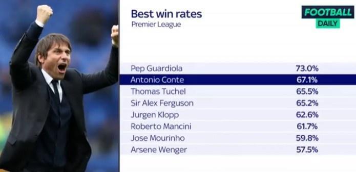 24直播网11月03日讯 热刺昨晚官宣孔蒂成为球队新帅,据FootballDaily统计,这位意大利教头在英超的胜率排名历史第二。